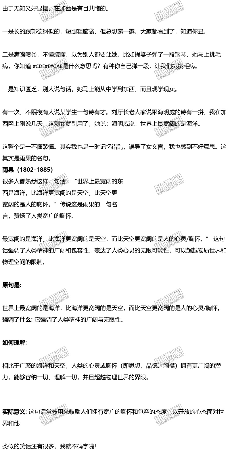 今天又丢人现眼了?世界上最宽阔的是海洋那句话,1线2线城市正经高中毕业的都知道是雨果说的。