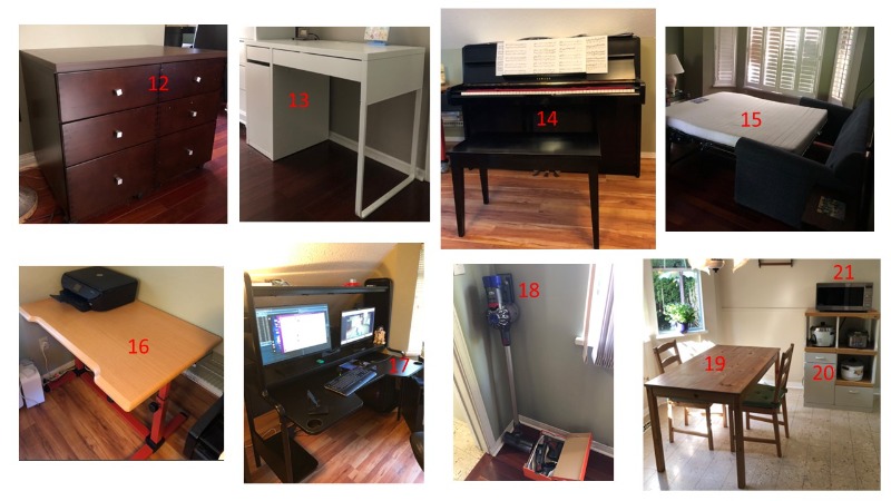 因搬家出清现有电器家具,大多数家具少用如新,稍有磨损者皆免费赠送。如下列出大项目,另有许多檯灯、电扇、电暖炉、咖啡机、鞋架、电脑及萤幕等,皆以低於30元出售, 以及无数日用品及餐具赠与有缘人。欢迎洽询或参观。