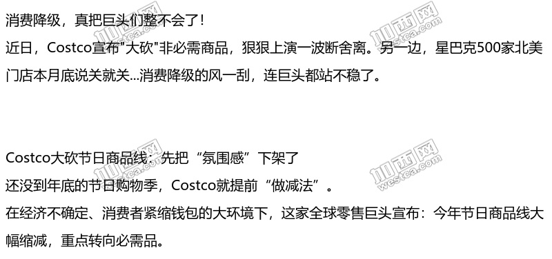 bbsang2 于 2025-9-27 13:55 写道: Costco首席执行官Ron Vachris在第四季度财报电话会议上表示,在全球经济不确定的背景下,公司不得不重新思考如何为假日季备货。 “我们的采购团队在为今年假日季订货时,必须重新评估所有非必需品——包括玩具、节日装饰品等。我们大幅削减了这类商品的库存。” 首席财务官Gary Millerchip补充称,消费者在非必需品支出上依然“非常谨慎”。相反,最受欢迎的依然是热狗套餐、烤鸡和Kirkland卫生纸。 Costco调整产品结构后,为一些通常假日季不会上架的商品腾出了货架空间,例如家具、桑拿房和后院储物棚等高价耐用品。 CEO Vachris表示:“这仍然会是一个令人期待的节日季,因为我们有一些以往从未卖过的新商品。” 皇家银行(RBC)数据显示,加拿大核心零售销售在7月已连续第三个月放缓,其中消费者在必需品上的支出最受抑制,尤其是加油站的销售额下降明显。 换句话说,如今消费者越来越务实了,只买刚需,不花冤枉钱。 星巴克本月底关店500家:加拿大占57家 与Costco的“减配”不同,星巴克直接来了场“大撤退”。 星巴克本周突然宣布,将在9月底前(距离发文时间仅剩3天)关闭北美约400至500家门店,作为其10亿元重组计划的一部分。其中,加拿大已确认关店57家,仅多伦多就有13家。 相比往年的正常关店规模,此次行动更为激烈。首席执行官Brian Niccol承认,这是“一项更为重大的行动,我们理解这将对员工和顾客产生影响”,此举也是公司艰难推进的“重返星巴克”转型战略的一部分。 |