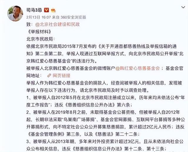2020年,网络举报者司马3忌一纸长文,指控她的基金会涉嫌违规操作,数额高达5亿。