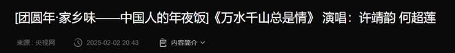 作为央视春节档的重要衍生节目,在这个舞台,何超莲与许靖韵合唱一首经典歌曲《万水千山总是情》,打动电视机前的无数观众。