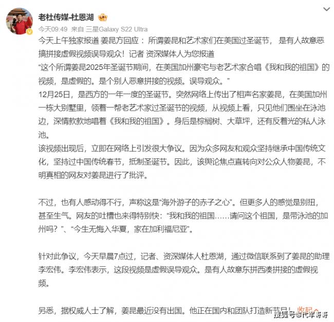 就在舆论即将失控的12月26日,事件出现关键转折。资深媒体人杜恩湖发布独家报道,披露了与姜昆助理李宏伟的沟通内容,正式给出权威回应。李宏伟明确否认了“赴美过圣诞”的说法,直指网传视频是“恶意拼接的虚假内容”,画面中的人物与场景根本不属于同一时空,是别有用心之人通过剪辑拼接、模糊处理后刻意误导公众的产物。- 新闻来源于其它媒体,内容不代表本站立场!